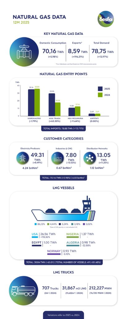 - Total natural gas demand in Greece reached 78.75 TWh in 2025, marking a 14% increase compared to 2024.